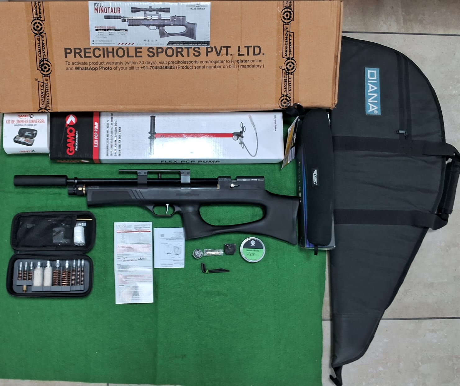 Experience the ultimate shooting setup with this all-in-one combo pack, tailored for airgun enthusiasts and professionals alike. This comprehensive kit includes the powerful PX120 Minotaur X3 air rifle, known for its precision, durability, and high-performance capabilities. Whether you’re practicing target shooting or small-game hunting, the Minotaur X3 delivers exceptional results with every shot.
